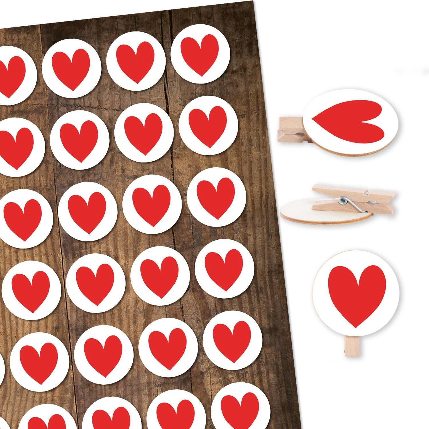 35 runde Holzscheiben Klammern zum Basteln und Dekorieren mit Kindern oder für Erwachsene. Durchmesser: 3,2 cm. Hier im Set mit hochwertigen selbstklebenden Papieraufklebern in rot weiß mit Herz und mit Durchmesser 3,2 cm, mit denen ihr die Klammern verzieren könnt. Anwendungsbeispiele: Verschließen von Geschenktüten, Geschenkverpackungen, zum Verzieren von Geschenken, zum Aufhängen von Fotos, Briefen oder Anhängern oder zum Basteln von Namensschildern oder Tischkarten zu Hochzeit, Kommunion, Taufe, Kindergeburtstag, Geburtstag, Fest, Feier, Veranstaltungen, Jubiläum - auch geeignet für Gastgeschenke, Mitgebsel,