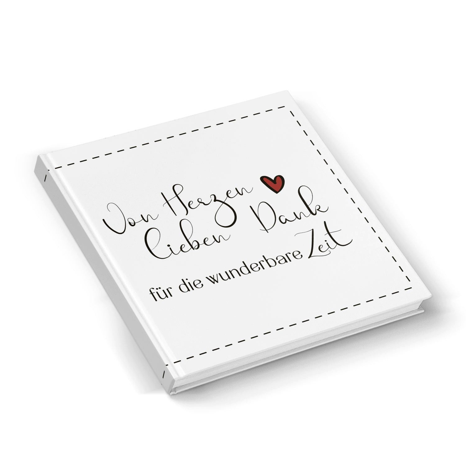 • Schönes kleines Buch mit leeren Seiten und dem Titel "Von Herzen lieben Dank für die wunderbare Zeit". Farbe: weiß, schwarz, rot. Format: quadratisch. Ein tolles Geschenk zur Verabschiedung und zum Dank an Kollegen, Vorgesetzte, Freunde, Erzieher, Lehrer und andere besondere Menschen.