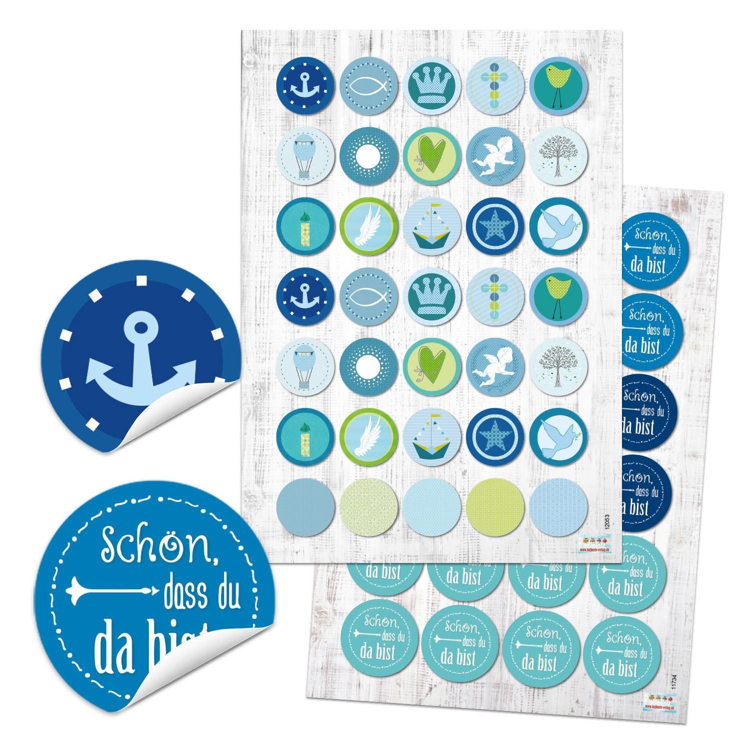 • Motive: Schiffsanker, Fisch, Krone, Kreuz, Vogel, Baum, Ballon, Herz, Engel, Engelsflügel, Segelboot, Stern, Kerze und Blankoetiketten. Wegen den Symbolen perfekt zur Taufe, Kommunion, Kindergeburtstag. Durchmesser der 35 Aufkleber: 3 cm und die Schön, dass Du da bist Sticker haben 4 cm.