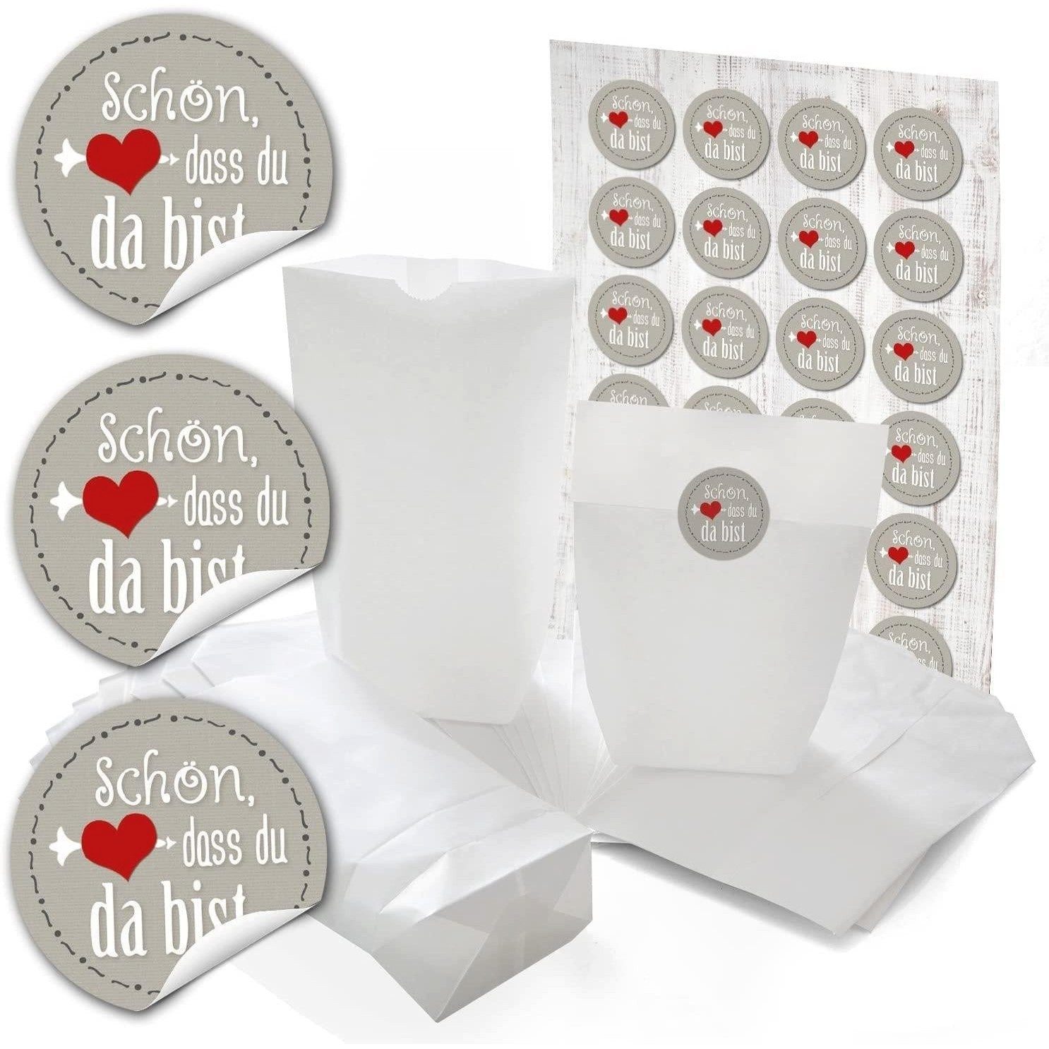 Praktisches Papier-Tüten-Set mit Kreuzbodenbeuteln aus stabilem Kraftpapier (Größe: 14 x 22 x 5,6 cm). Die runden „Schön, dass du da bist“-Aufkleber (Durchmesser: 4 cm) sind hochwertig im QUALITÄTSDRUCK gefertigt.