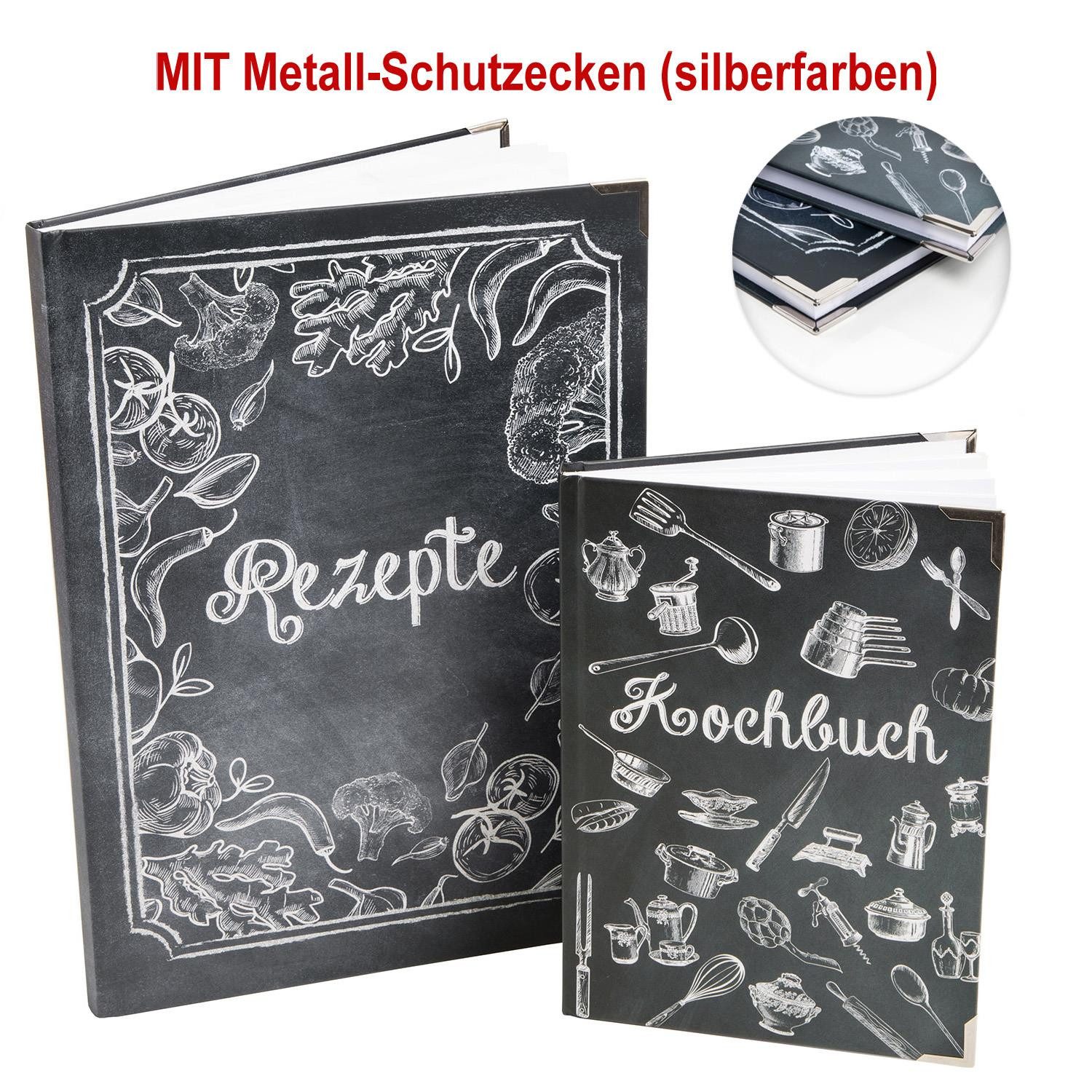 Hochwertiges Bücher Set bestehend aus zwei verschiedenen Rezeptbüchern mit leeren weißen Seiten zur freien und individuellen Gestaltung. Ein Buch in DIN A4 mit 164 Seiten und eines in DIN A5 mit 136 leeren weißen Seiten. MOTIV: Tafelkreide-Optik, schwarz-weiß, verziert mit verschiedenen Gemüsesorten und das kleinere Buch in schwarz und weiß verziert mit verschiedenen Küchenutensilien und dem Titel KOCHBUCH.