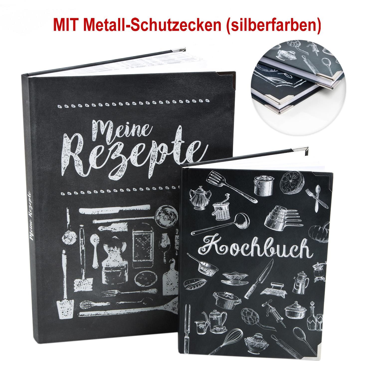 Tolles großes Bücher Set bestehend aus zwei verschiedenen Rezeptbüchern mit leeren weißen Seiten zur freien und individuellen Gestaltung. Ein Buch in DIN A4 mit 164 Seiten und eines in DIN A5 mit 136 leeren weißen Seiten. MOTIV: Tafelkreide-Optik, schwarz-weiß, verziert mit verschiedenen Küchenutensilien und dem Titel KOCHBUCH bzw. MEINE REZEPTE. Die Bücher haben jeweils einen festen Einband - Hardcover, sind fadengeheftet und gebunden.