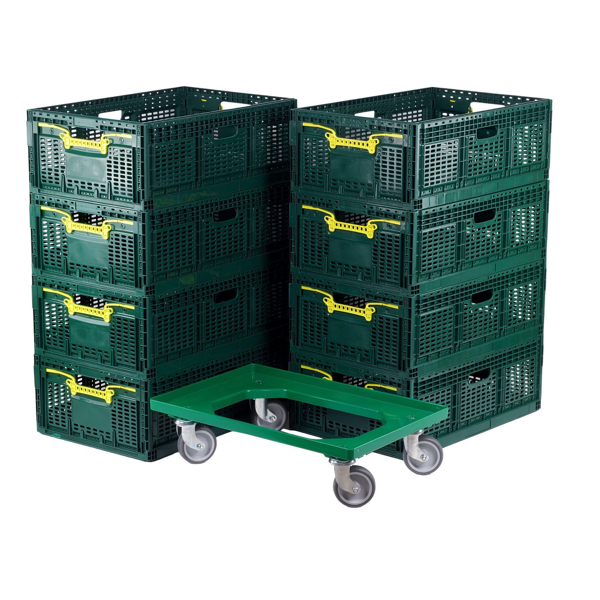 Unser Set aus 8 grünen Klappboxen und einem passenden Transportroller ist die perfekte Ergänzung für Ihren Haushalt oder Betrieb. Die Kisten sind aus robustem, lebensmittelechtem PP-Material gefertigt und bieten mit den Maßen 600 x 400 x 219 mm ausreichend Platz für Produkte, Lebensmittel und andere Gegenstände. Dank der praktischen Klappfunktion lassen sich die Boxen im Handumdrehen klein zusammenfalten, was die Aufbewahrung und den Transport enorm erleichtert.