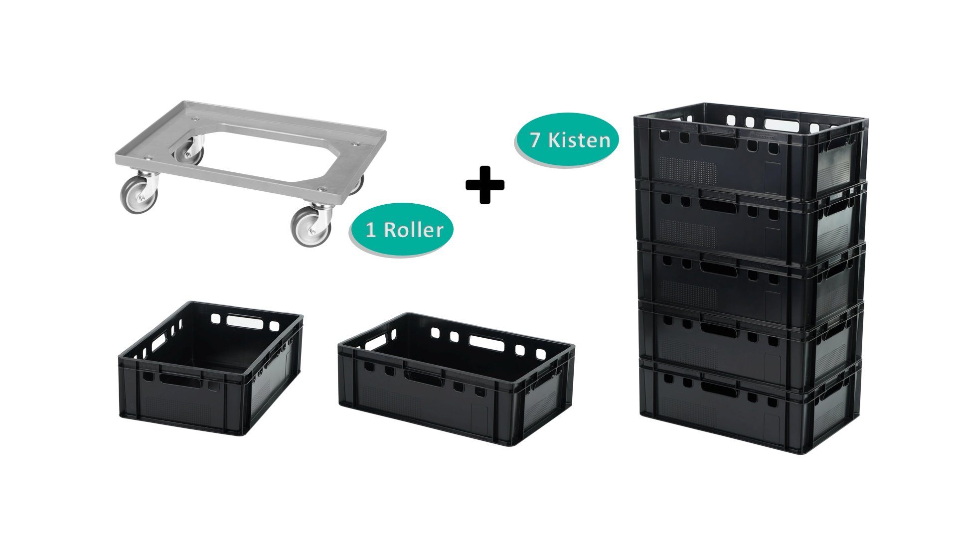 Praktisches Set aus E2-Kisten und Transportroller für den vielseitigen Einsatz