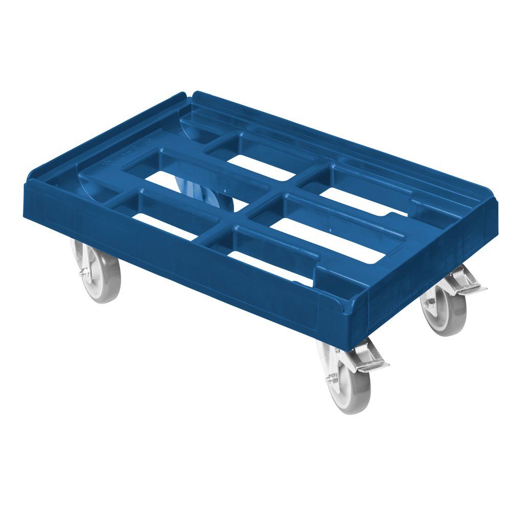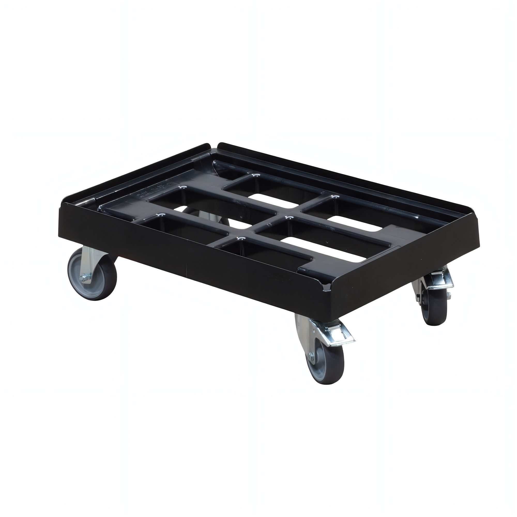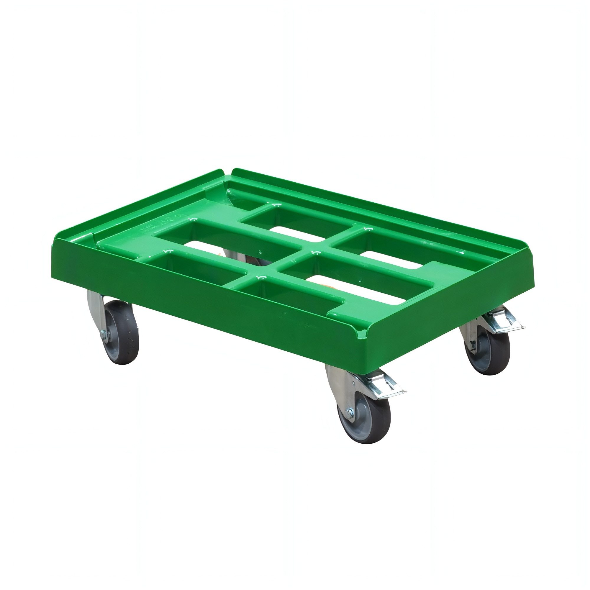 Wendiger Kistenroller für Lager, Produktion, Catering und Handel: Zwei Lenkrollen mit Feststeller halten sicher am Platz, zwei weitere Lenkrollen sorgen für leichtes Manövrieren. Passend für Euronorm-Kisten 600×400 mm (auch 400×300 mm quer).