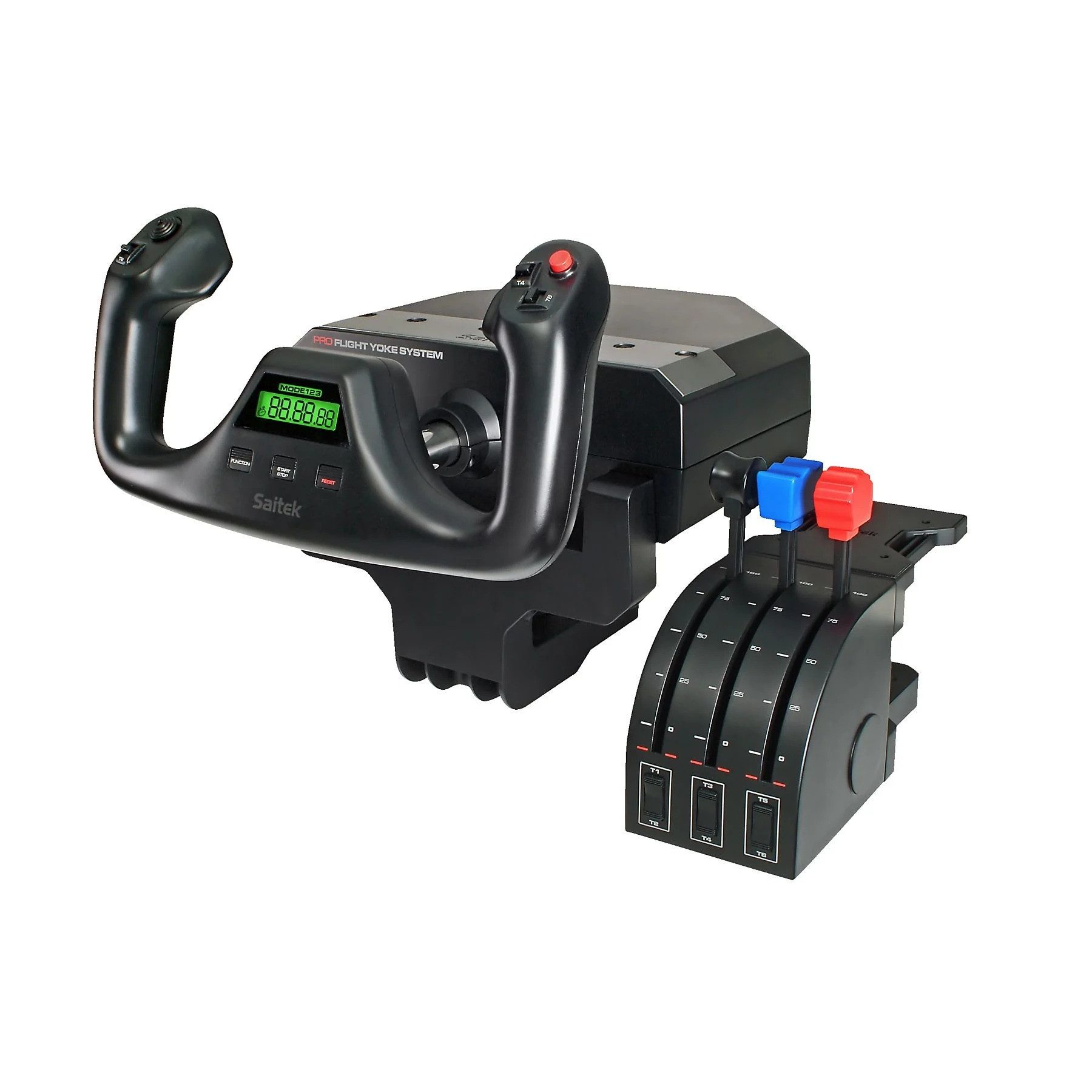 Das Yoke System verfügt über ein separates Schubhebelmodul mit drei Achsen, das Ihnen die Kontrolle über Schub, Propeller und Gemisch gibt. Jeder Hebel kann individuell konfiguriert werden, um die Anforderungen verschiedener Flugzeugtypen zu erfüllen.