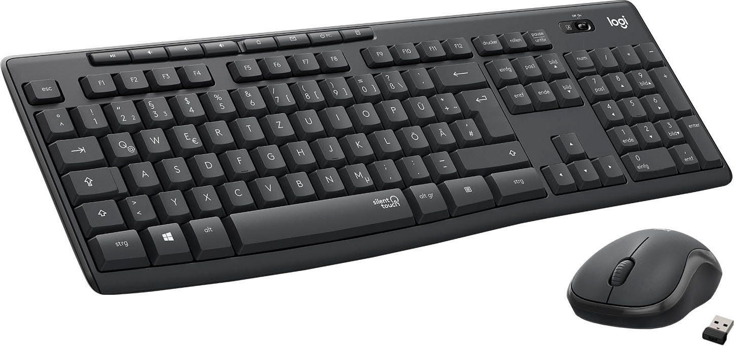 Lieferumfang | 1 Batterie vom Typ AA (bereits eingelegt) 2 Batterien vom Typ AAA (bereits eingelegt) Bedienungsanleitung Kabelloser USB-Empfänger Maus Tastatur |