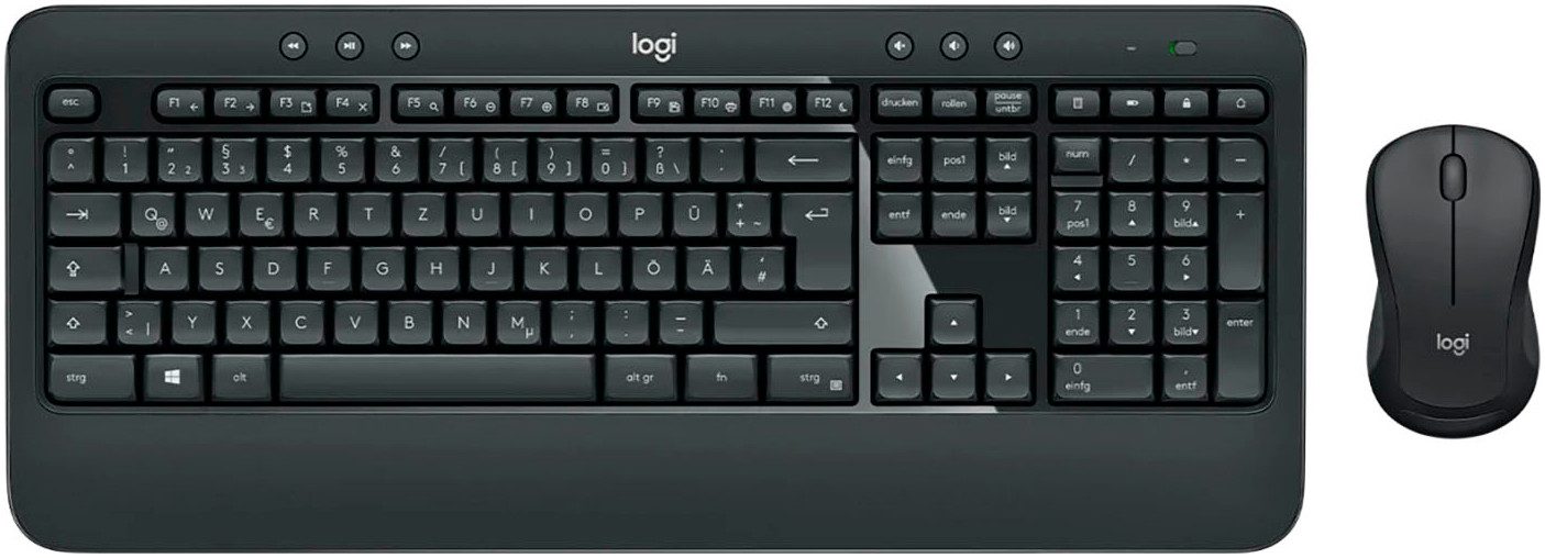 Lieferumfang | 1 Batterie vom Typ AA (bereits eingelegt) 2 Batterien vom Typ AAA (bereits eingelegt) Bedienungsanleitung Tastatur USB-Empfänger |