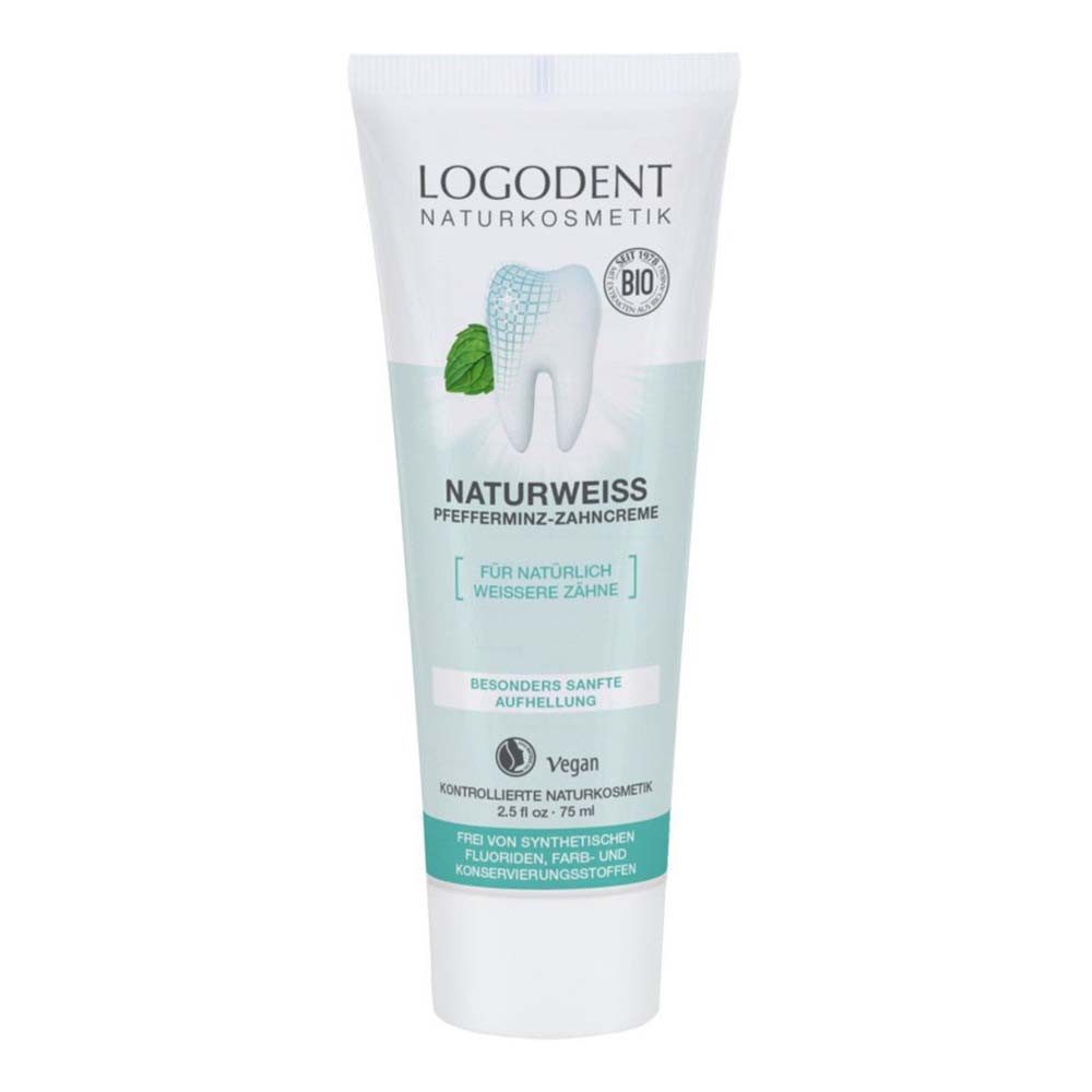 Die LOGODENT Naturweiß Zahncreme Pfefferminz bietet extra schonende Reinigung und eine sanfte Aufhellung der Zähne.