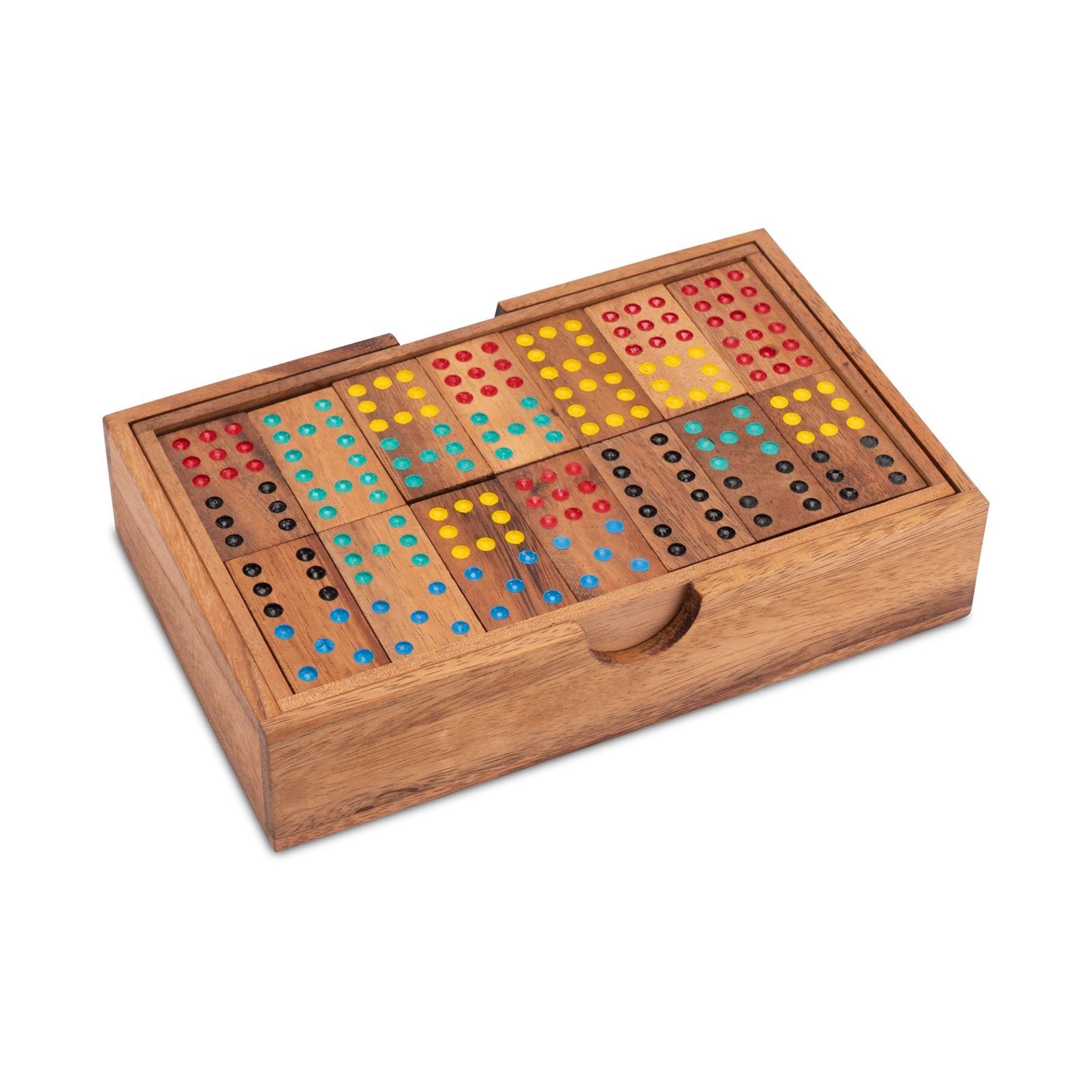 Die 56 Spielsteine werden im massiven Holzkasten mit Deckel sicher aufbewahrt – aus dunklem Samena-Holz, mit angenehm glatter Oberfläche. Всеs sauber verarbeitet, wertig in der Hand – und bereit für die nächste Runde.