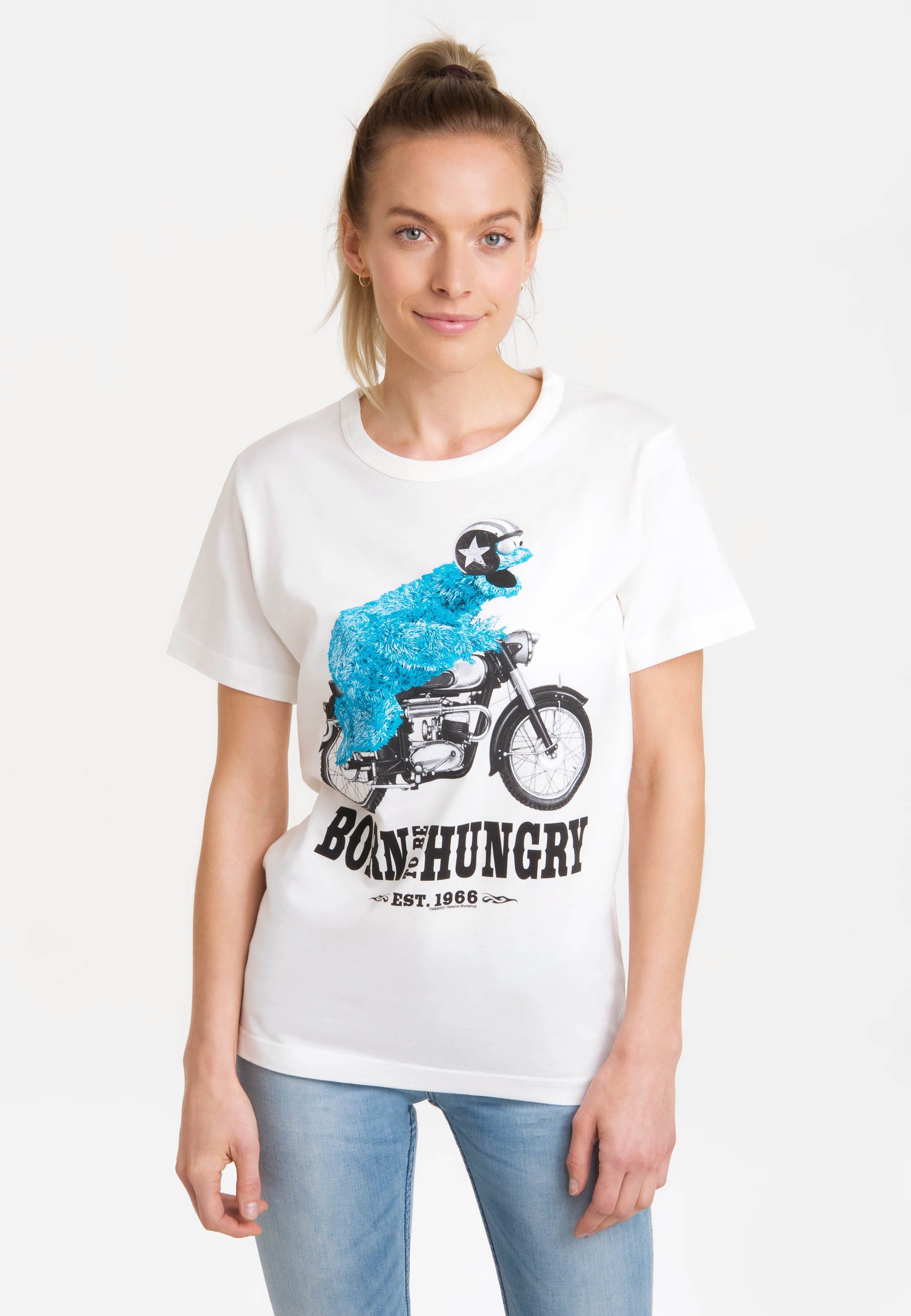 Das bunte Grafik-T-Shirt "Cookie Monster – Born To Be Hungry" von Logoshirt ist mit dem weltberühmten, dauerhungrigen Held aus der Sesamstrasse, dem Krümelmonster, bedruckt. Das große Monster mit den rollenden Augen liebt über alles Kekse. Das T-Shirt ist ein echtes Must-have für Sesamstrasse-Fans. Das kurzärmlige Oberteil ist gerade geschnitten und lässt sich sehr gut kombinieren. Wegen des hochwertigen und langlebigen Siebdrucks im Retro-Look wirkt das Grafik-T-Shirt wie ein Original aus den 60ern und ist ein echter Hingucker. Aufgrund der Einlaufvorbehandlung und seiner hervorragenden Qualität bleibt das Shirt auch nach mehreren Wäschen formstabil. Das T-Shirt ist aus 100 % weicher und angenehmer Baumwolle hergestellt. Ein T-Shirt, das einfach immer passt! Was will man mehr? Einfach an warmen Sommerabenden mit Shorts kombinieren oder beim Ausflug in die Stadt lässig mit Rock oder Jeans tragen. So ist schnell und einfach für jede Gelegenheit das richtige Outfit gefunden. Logoshirt steht für lizenziertes und authentisches Originaldesign.