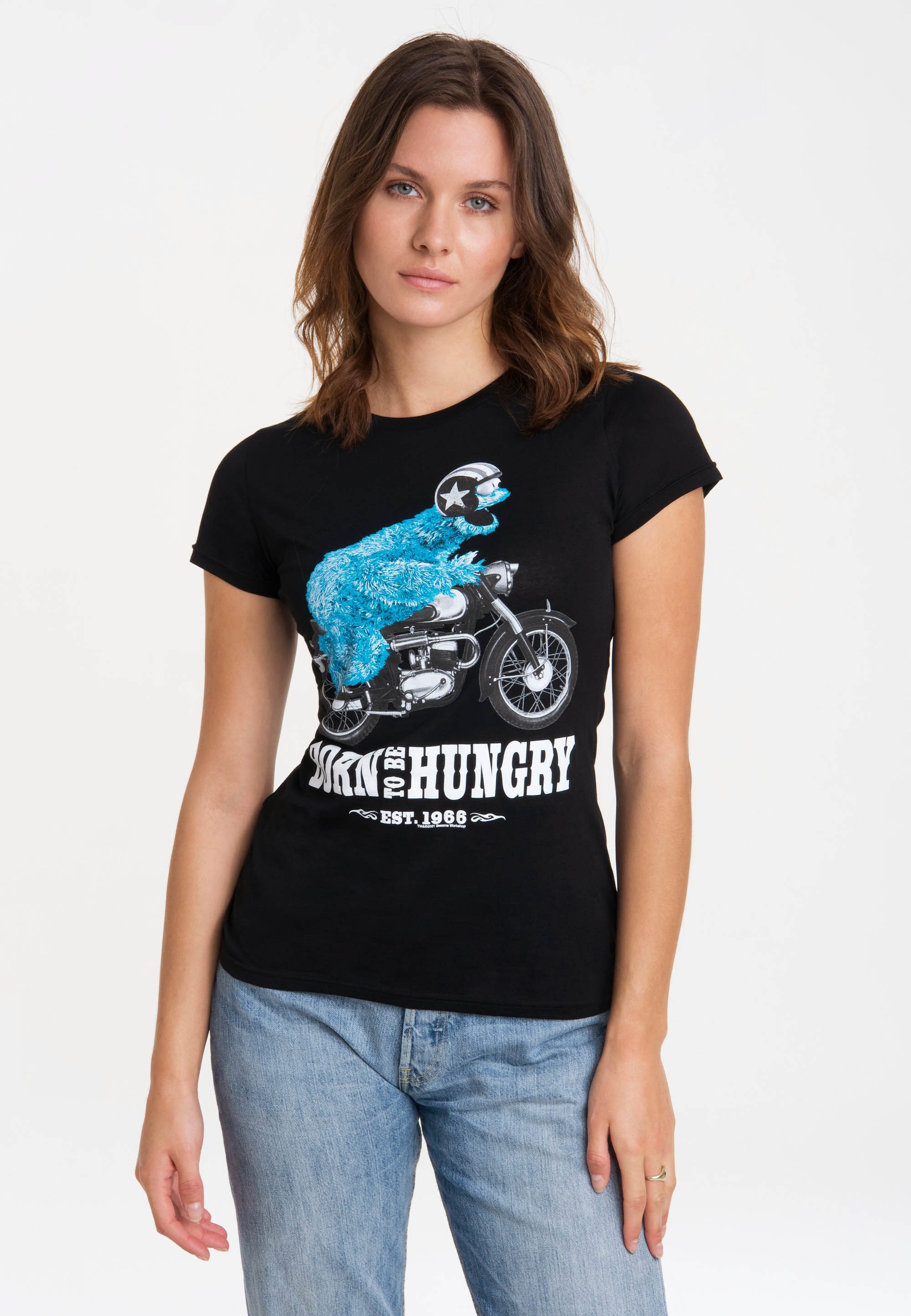 Das bunte Grafik-Shirt für Damen "Cookie Monster - Born To Be Hungry" von Logoshirt ist mit dem weltberühmten, dauerhungrigen Helden aus der Sesamstraße, dem Krümelmonster, bedruckt. Das große Monster mit dem blauen Zotteln und den rollenden Augen liebt über alles Kekse. Das T-Shirt ist ein echtes "Must Have" für Sesamstraße-Fans. Das kurzärmlige Oberteil ist figurbetont, schmal geschnitten und lässt sich sehr gut kombinieren. Wegen des hochwertigen und langlebigen Siebdruckes im Retro-Look wirkt das T-Shirt wie ein Original aus den 60ern und ist ein echter Hingucker. Aufgrund der Einlaufvorbehandlung und seiner hervorragenden Qualität bleibt das Shirt auch nach mehreren Wäschen formstabil. Das T-Shirt ist aus 100% weicher und angenehmer Baumwolle hergestellt. Ein Modell, das einfach immer passt! Was will man mehr? Einfach an warmen Sommerabenden mit Shorts kombinieren oder beim Ausflug in die Stadt lässig mit Rock oder Jeans tragen. So schnell und einfach ist für jede Gelegenheit das richtige Outfit gefunden. Logoshirt steht für lizenziertes und authentisches Originaldesign.