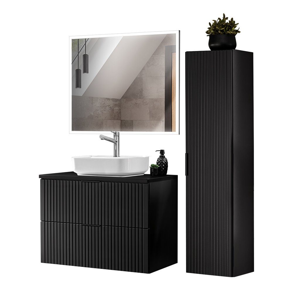 Unsere Badmöbel-Serie ADELAIDE-56-BLACK vereint modernes Design mit Eleganz. Matt schwarze Möbel, ergänzt mit goldfarbenen, chromfarbenen oder schwarzen Griffen macht aus jedem Badezimmer einen Wohlfühlort.
