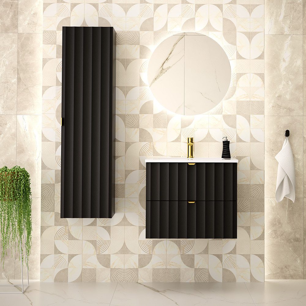 Verleihe deinem Badezimmer ein stilvolles Update mit unserer modernen Badezimmermöbelserie. Die eleganten, gewellten Fronten in schwarz matt verleihen dem Raum einen Hauch von Luxus und lassen ihn neu erstrahlen. Die goldfarbenen Griffe sorgen zusätzlich für ein edles Design. Dank der Softclose-Funktion schließen die Schubladen sanft und leise – ideal für den täglichen Gebrauch. Diese Möbel bieten nicht nur praktischen Stauraum, sondern machen dein Badezimmer zu einer echten Wohlfühloase.