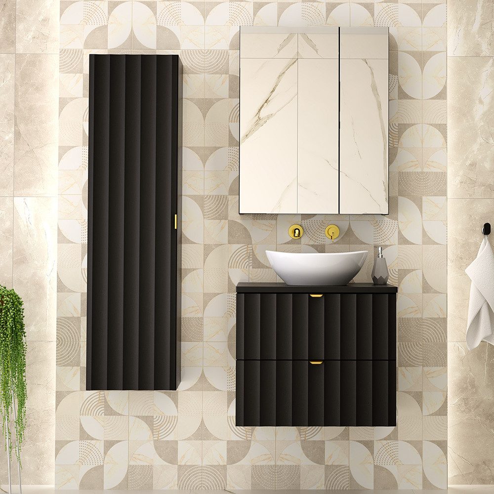 Verleihe deinem Badezimmer ein stilvolles Update mit unserer modernen Badezimmermöbelserie. Die eleganten, gewellten Fronten in schwarz matt verleihen dem Raum einen Hauch von Luxus und lassen ihn neu erstrahlen. Die goldfarbenen Griffe sorgen zusätzlich für ein edles Design. Dank der Softclose-Funktion schließen Tür und Schubladen sanft und leise – ideal für den täglichen Gebrauch. Diese Möbel bieten nicht nur praktischen Stauraum, sondern machen dein Badezimmer zu einer echten Wohlfühloase.