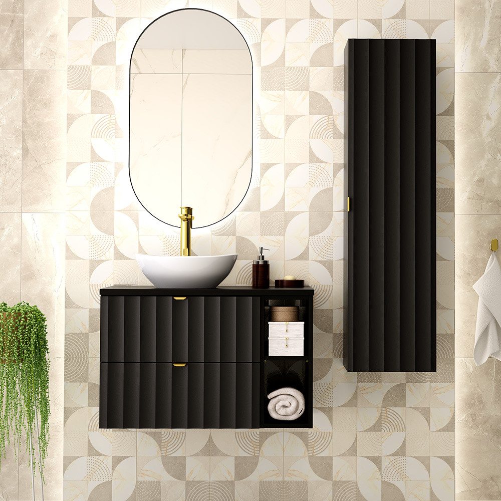 Verleihe deinem Badezimmer ein stilvolles Update mit unserer modernen Badezimmermöbelserie. Die eleganten, gewellten Fronten in schwarz matt verleihen dem Raum einen Hauch von Luxus und lassen ihn neu erstrahlen. Die goldfarbenen Griffe sorgen zusätzlich für ein edles Design. Dank der Softclose-Funktion schließen Tür und Schubladen sanft und leise – ideal für den täglichen Gebrauch. Diese Möbel bieten nicht nur praktischen Stauraum, sondern machen dein Badezimmer zu einer echten Wohlfühloase.