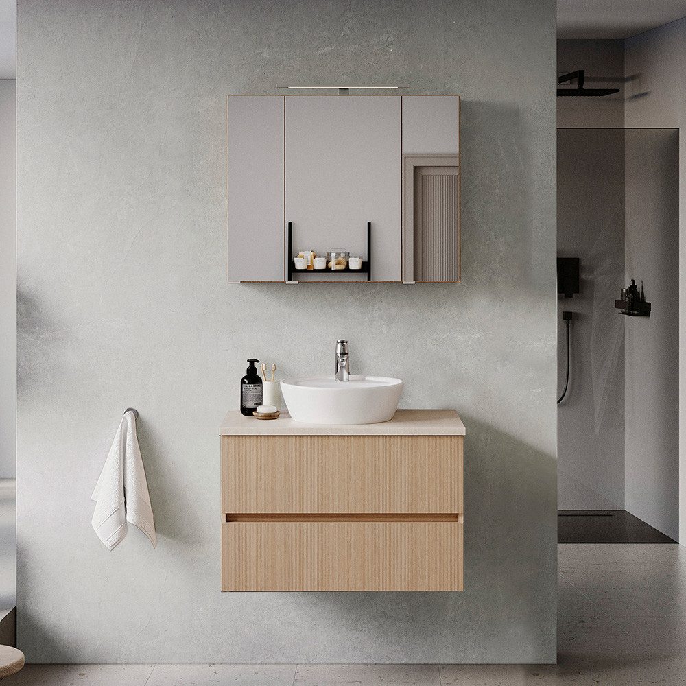 Das runde Aufsatzwaschbecken auf der hellen Platte wird sofort zum Blickfang. Zwei großzügige Schubladen bieten dir ausreichend Platz für alles, was du täglich brauchst. Der Spiegelschrank mit drei Türen, Beleuchtung und integrierter Steckdose sorgt für Ordnung und Komfort. Die grifflose Front unterstreicht den modernen Look.
