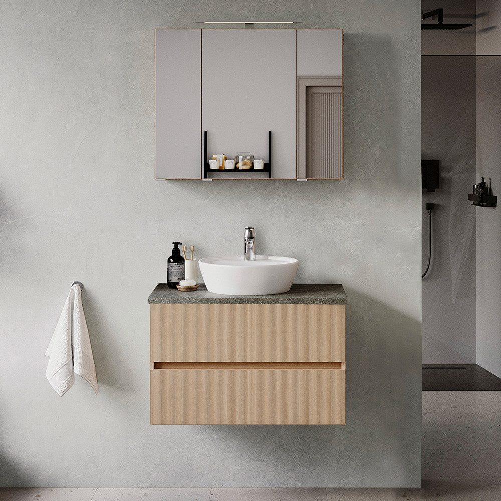 Das runde Aufsatzwaschbecken wird zum stilvollen Highlight und setzt gemeinsam mit der Platte einen ausdrucksstarken Akzent. Zwei große Schubladen bieten dir viel Platz für Pflegeprodukte und Handtücher. Der Spiegelschrank mit drei Türen, integrierter Beleuchtung und Steckdose sorgt für beste Übersicht im Alltag. Dank der grifflosen Front wirkt das Set besonders modern.