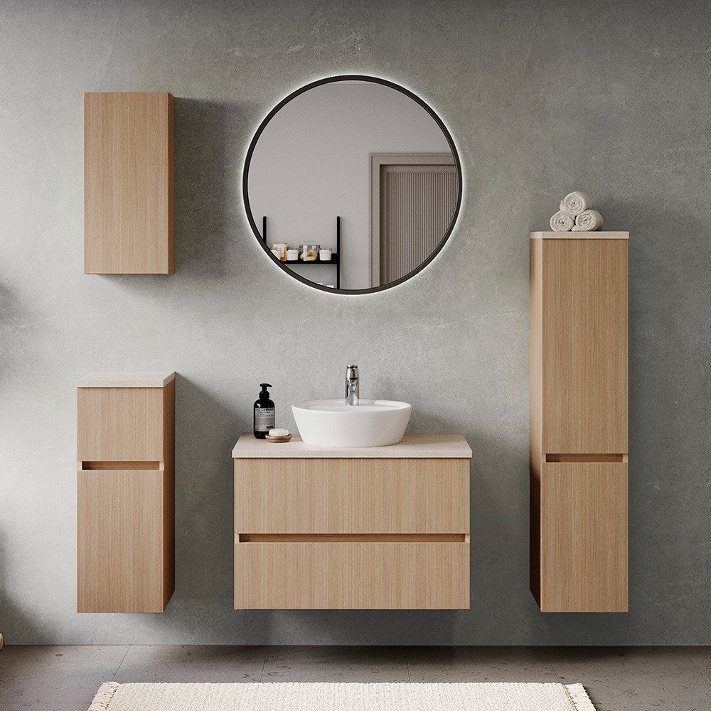 Das elegante Aufsatzwaschbecken und der runde Spiegel mit LED-Ambientebeleuchtung setzen stilvolle Highlights. Türen und Schubladen schließen dank Softclose angenehm leise. Der Unterschrank und der Midischrank lassen sich flexibel stehend oder wandhängend montieren – für genau die Badgestaltung, die zu dir passt.