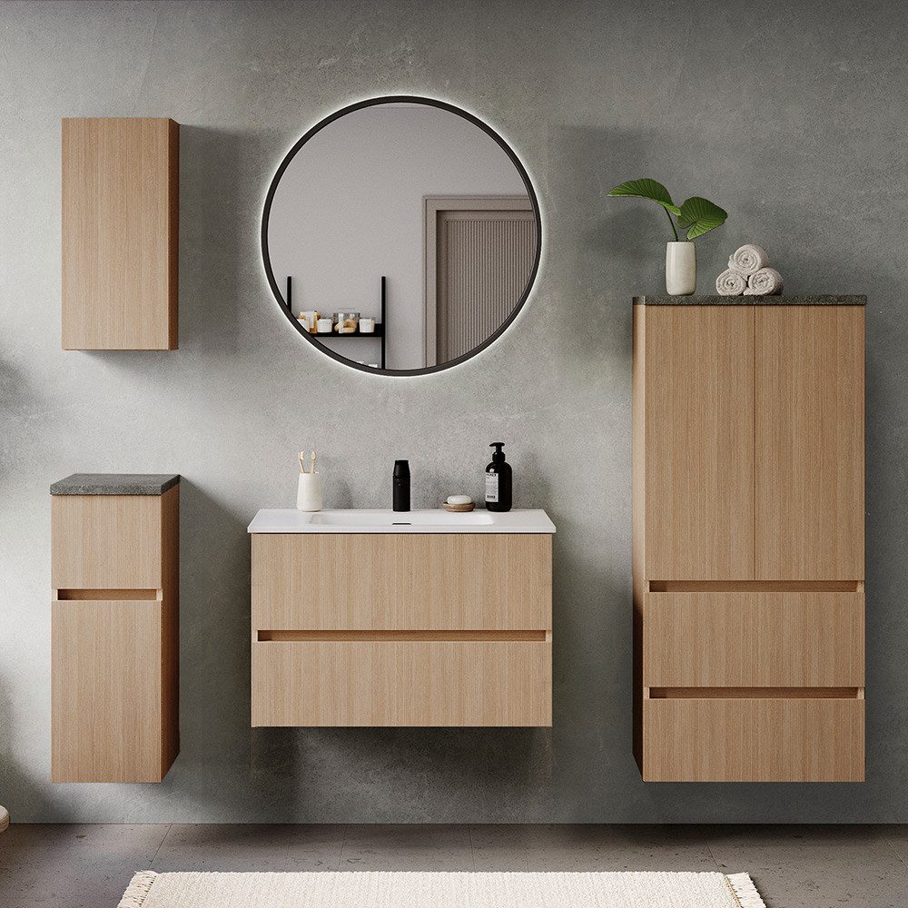 Dieses Badmöbel-Set überzeugt mit einer charmanten Kombination aus Eicheoptik und Oberböden in markanter Steinoptik dunkel.