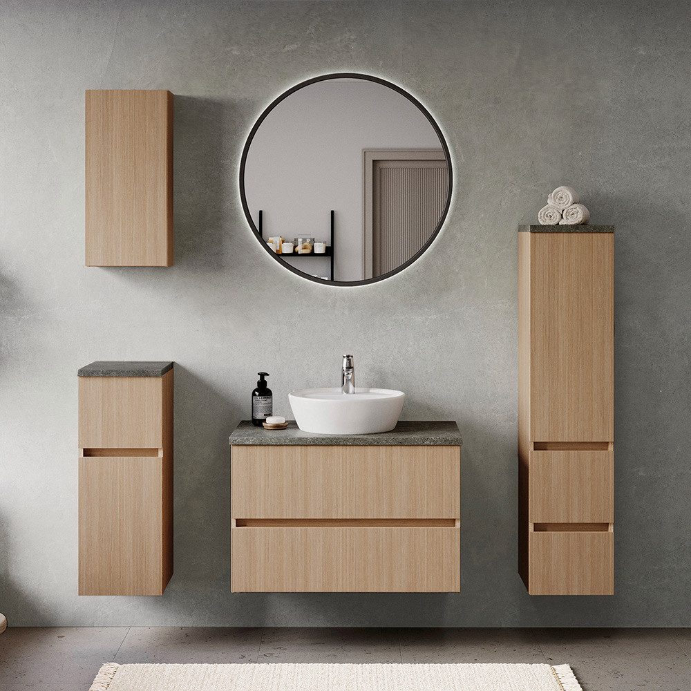 Die warme Holzoptik kombiniert mit der edlen Steinoptik dunkel schafft eine stilvolle und gleichzeitig gemütliche Atmosphäre. Der großzügige Waschtisch mit Aufsatzwaschbecken, der runde LED-Spiegel und jede Menge Stauraum bieten dir alles, was du für ein aufgeräumtes Bad brauchst. Besonders praktisch: Der Unterschrank und der Midischrank lassen sich flexibel stehend oder wandhängend montieren. Klare Linien, grifflose Fronten und Softclose sorgen für ein entspanntes und elegantes Ambiente.