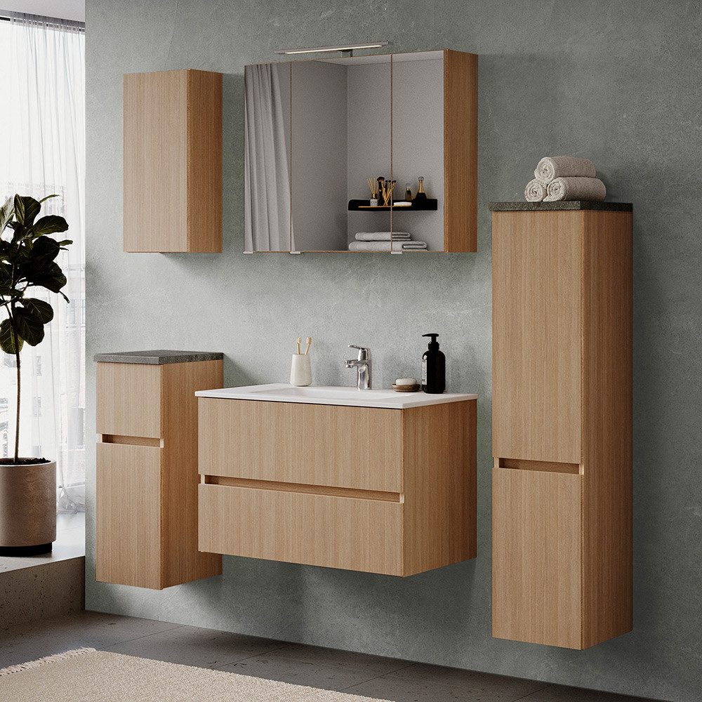 Dieses Badmöbel-Set kombiniert warme Eicheoptik mit einer ausdrucksstarken Waschtischplatte in Steinoptik dunkel – für ein modernes Bad mit Charakter.