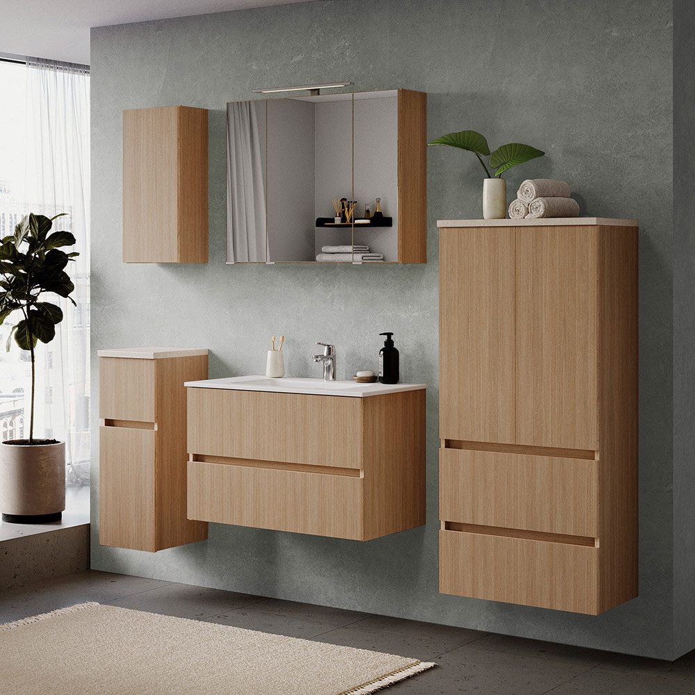 Hier trifft warmes Design auf cleveren Stauraum – dieses Badmöbel-Set verwandelt dein Badezimmer in eine echte Wohlfühloase.