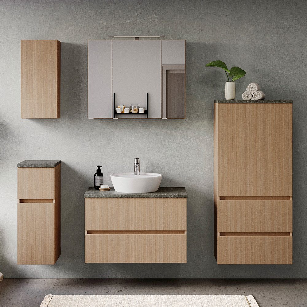 Dieses Badmöbel-Set überzeugt mit harmonischer Holzoptik und einer eleganten Oberplatte in Steinoptik.