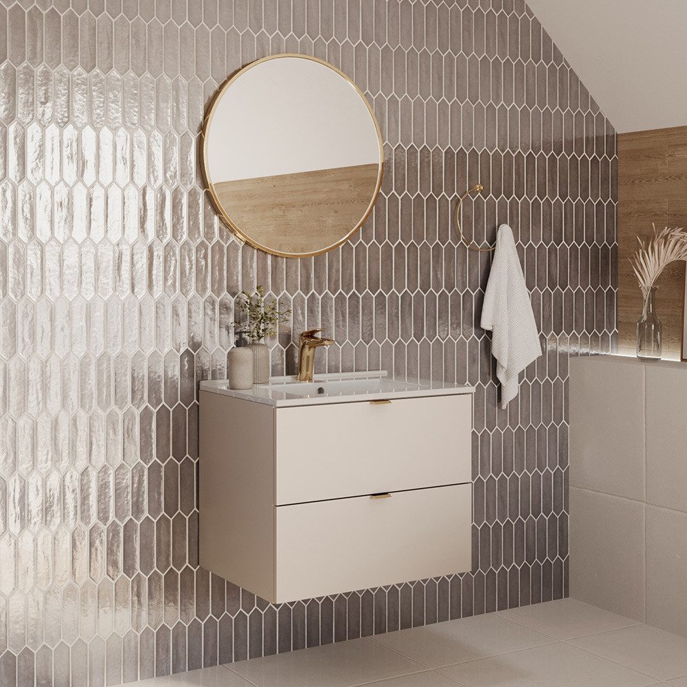 Erfrische dein Badezimmer mit unserer stilvollen Badmöbelserie in kaschmir, die Eleganz und Funktionalität meisterhaft kombiniert.