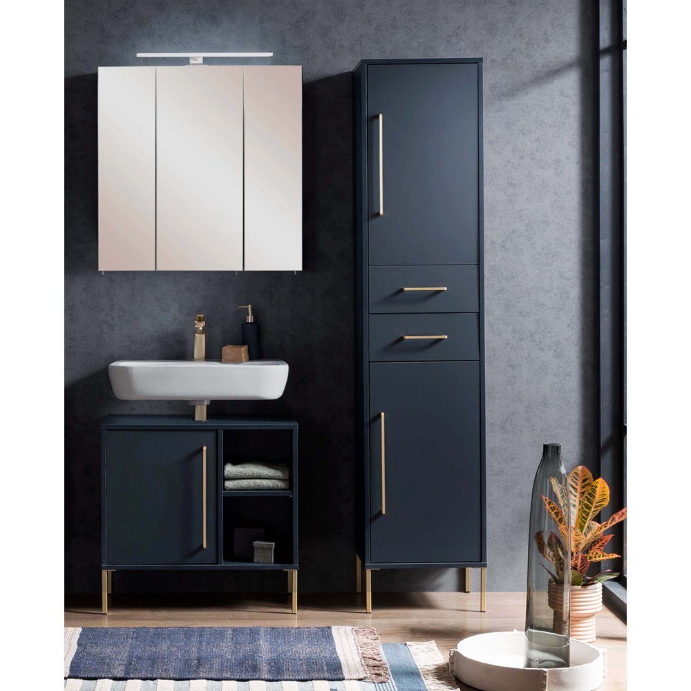 Die Badmöbel der Serie KELLA-80vereinen modernen Stil mit trendiger Farbe undsind Made in Germany. Siewerden sowohl funktionalen als auch optischen Ansprüchen gerecht. Von effizientem Stauraum bis hin zu tollem Design, hier bekommst du alles, was du in deinem Bad brauchst. Die Möbel innachtblau und Griffensowie Füßen in goldfarben, sind ein echter Hingucker. Die Serie bietet genügend Stauraum für Handtücher und weitere Badezimmerutensilien, die schnell griffbereit sein müssen. Die Schubladen und Türen sind mit einer Softclose Funktion ausgestattet, wodurch diese sich sanft schließen lassen. Das Programm gibt es in der Farbkombination nachtblau und waldgrün.