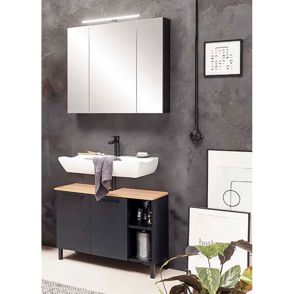 Verleihe mit unserer Serie MASON-80 deinem Badezimmer oder Gäste-WC einen Hauch von Luxus uns Modernität. Genieße das ansprechende Design in schwarz matt inklusive der edlen Metallgriffe und Glaselemente. Die Waschtischplatten in Artisan Eiche Nb. mit fühlbarer Holzstruktur bilden einen angenehmen Kontrast.