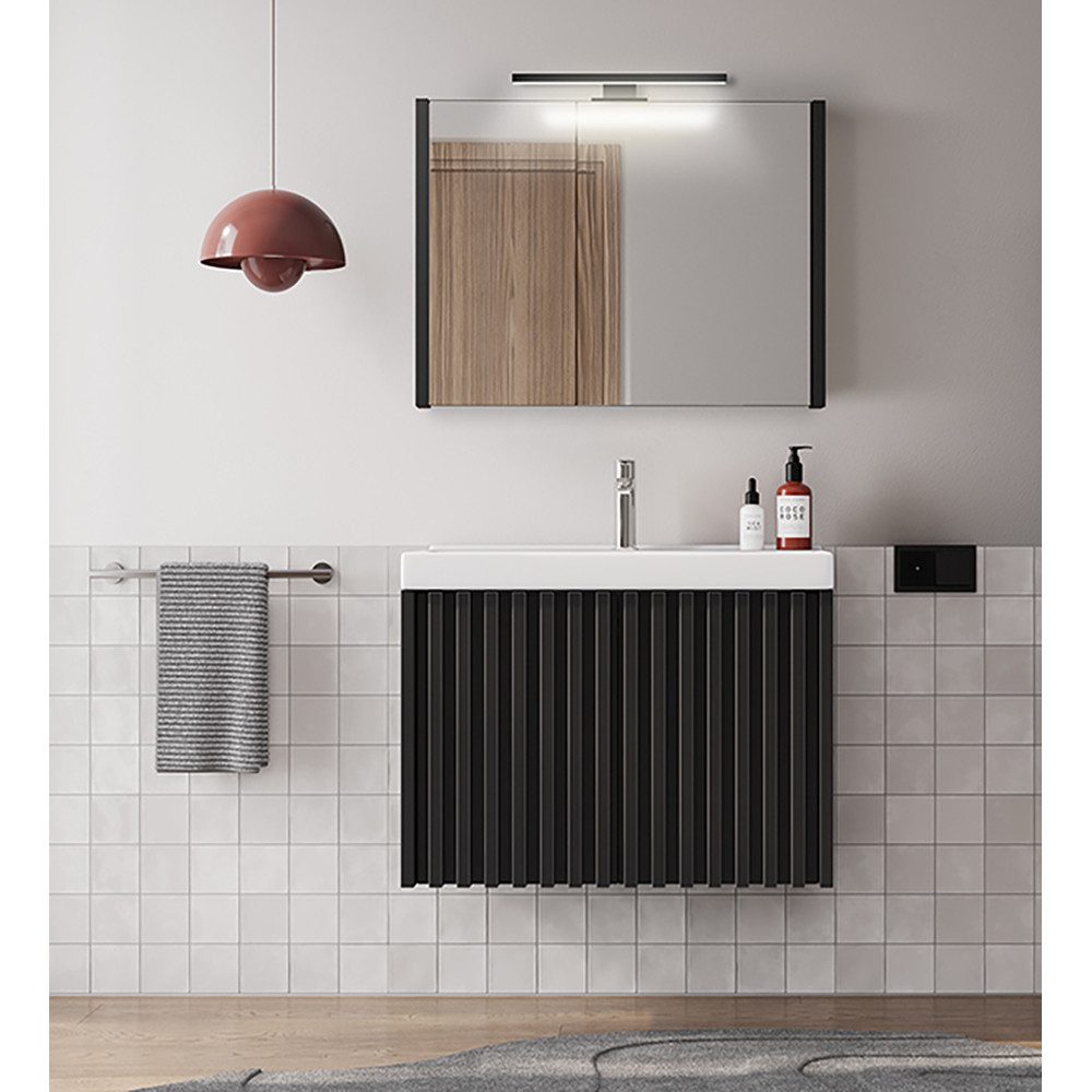 Entdecken Sie unsere moderne Badmöbel Serie NANTES-107 mit außergewöhnlichen Lamellenfronten in zeitlosem Schwarz. Eine perfekte Kombination aus Funktionalität und Ästhetik, um Ihrem Badezimmer einen Hauch von Luxus und Stil zu verleihen. Die geräumigen Schränke bieten jede Menge Stauraum, so dass man alle wichtigen Dinge immer griffbereit hat. Für ein Plus an Komfort sorgt das Softclose System, das für ein geräuscharmes Спрятать der Türen und Schubladen sorgt.