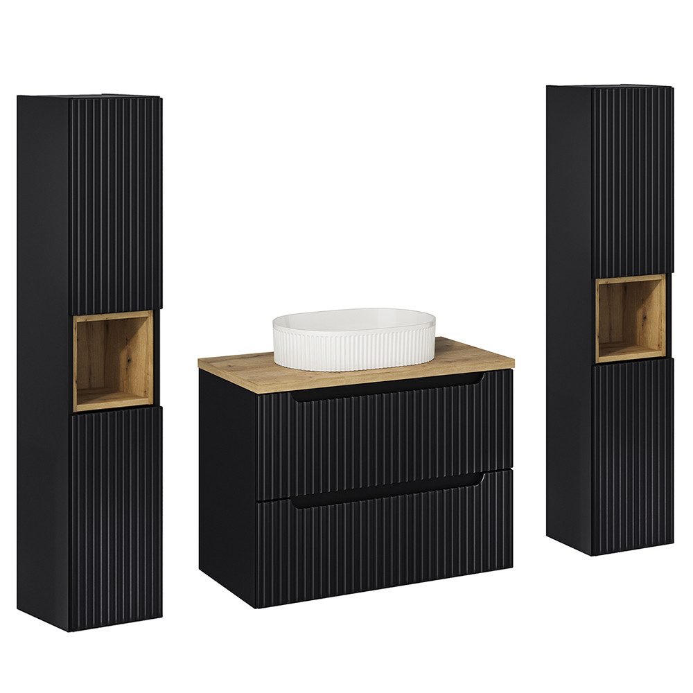 Diese Serie besticht durch ihre klaren, geradlinigen Formen und zeitlose Eleganz, hervorgehoben durch vertikale Rillen an den Fronten, die jedem Stück Tiefe und Charakter verleihen.