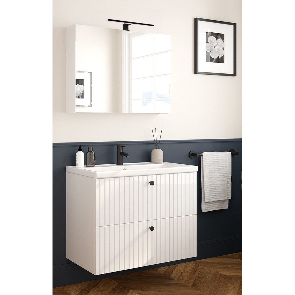 Stell dir vor, wie diese eleganten Badmöbel in weiß Hochglanz lackiert dein Badezimmer in eine Oase der Ruhe und des Stils verwandeln. Die gerillten MDF-Fronten setzen nicht nur modische Akzente, sondern sind auch ein Beweis für deinen exquisiten Geschmack. Die mattschwarzen Knopfgriffe aus Metall bieten einen attraktiven Kontrast zum strahlenden Weiß und sind zudem äußerst langlebig und leicht zu reinigen. Die Türen und Schubkästen sind mit einem Softclose-System ausgestattet, was den Komfort erhöht und gleichzeitig die Lebensdauer deiner Möbel verlängert, indem die Materialbelastung reduziert wird. Diese Badmöbel sind nicht nur optisch ein Highlight, sondern auch praktisch und pflegeleicht – eine Kombination, die im Alltag unbezahlbar ist. Sie bieten dir nicht nur ausreichend Stauraum, sondern organisieren deine Badutensilien auf ästhetisch ansprechende Weise.