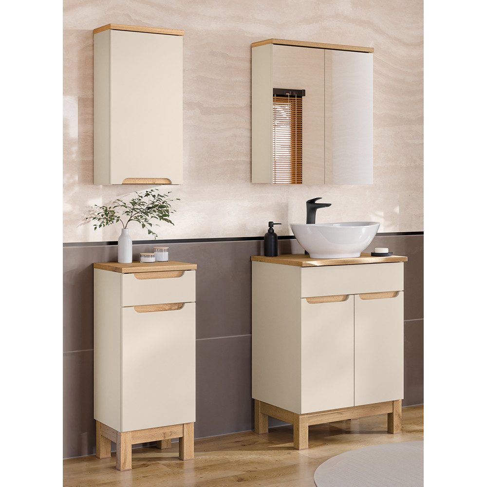 Dieses Badmöbel-Set verbindet zeitgemäßes Design mit einem Hauch von Natürlichkeit.