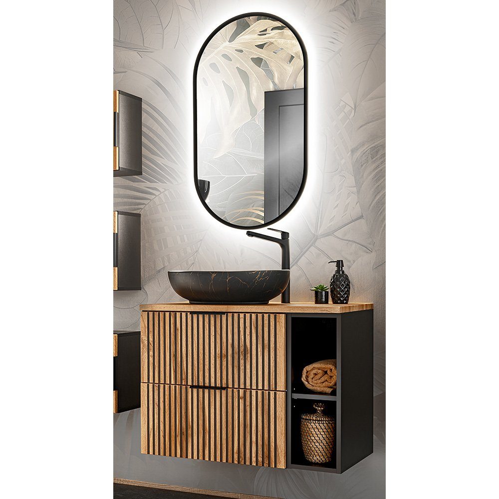 Setze mit unserer Serie XANTEN-56 dein Badezimmer in Szene. Die aufwändig gearbeiteten Fronten in Wotaneiche Nb. mit schwarzen Rillen unterstreichen das ausdrucksstarke und moderne Design der Badmöbel. Anthrazitfarbene Korpen und schwarze Griffe ergänzen die besondere Optik. Verschiedene Waschtisch- und Waschbeckenkombinationen lassen keine Wünsche offen. Komfortable Softclose-Systeme und MDF-Fronten unterstreichen die hochwertige Verarbeitung.