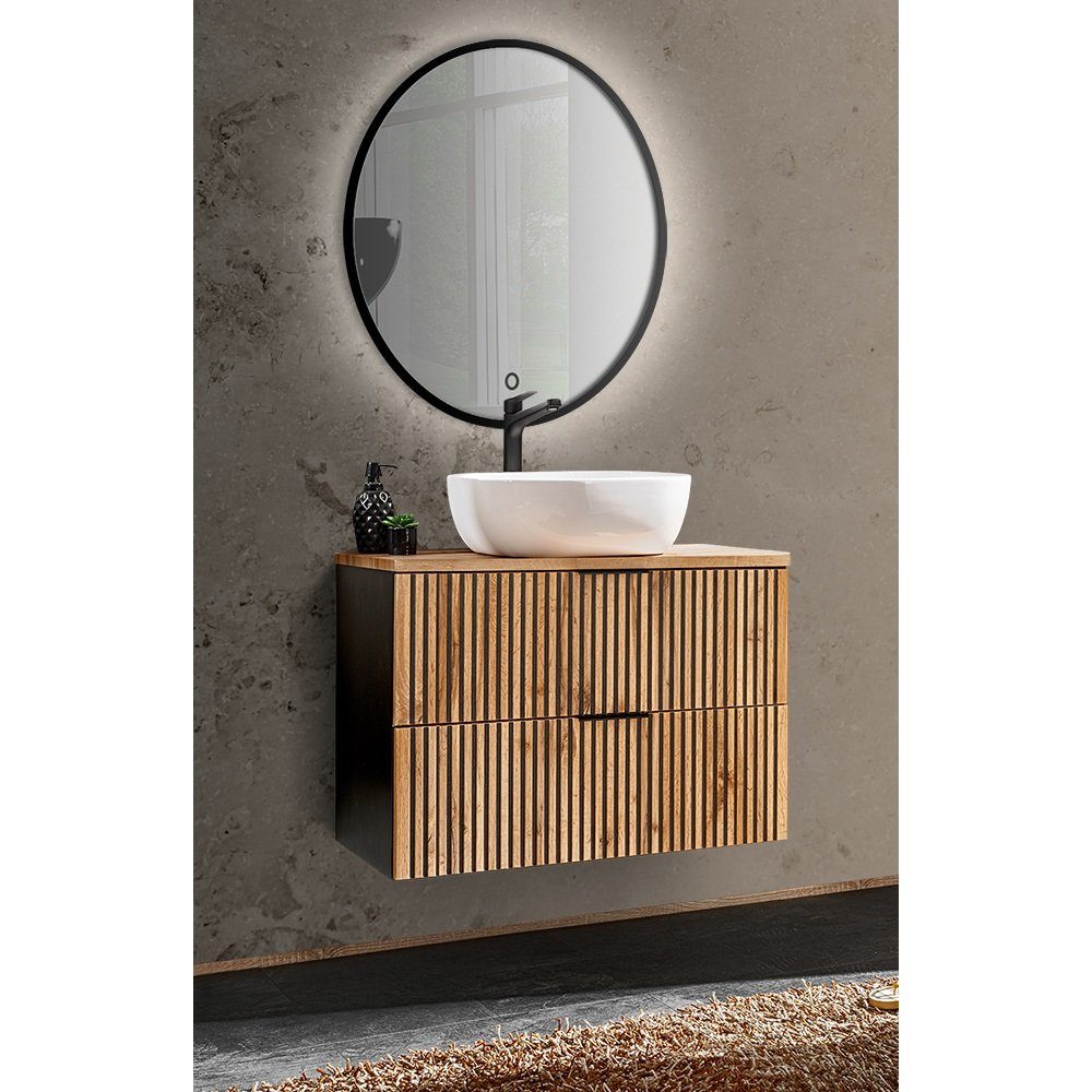 Setze mit unserer Serie XANTEN-56 dein Badezimmer in Szene. Die aufwändig gearbeiteten Fronten in Wotaneiche Nb. mit schwarzen Rillen unterstreichen das ausdrucksstarke und moderne Design der Badmöbel. Anthrazitfarbene Korpen und schwarze Griffe ergänzen die besondere Optik. Verschiedene Waschtisch- und Waschbeckenkombinationen lassen keine Wünsche offen. Komfortable Softclose-Systeme und MDF-Fronten unterstreichen die hochwertige Verarbeitung.