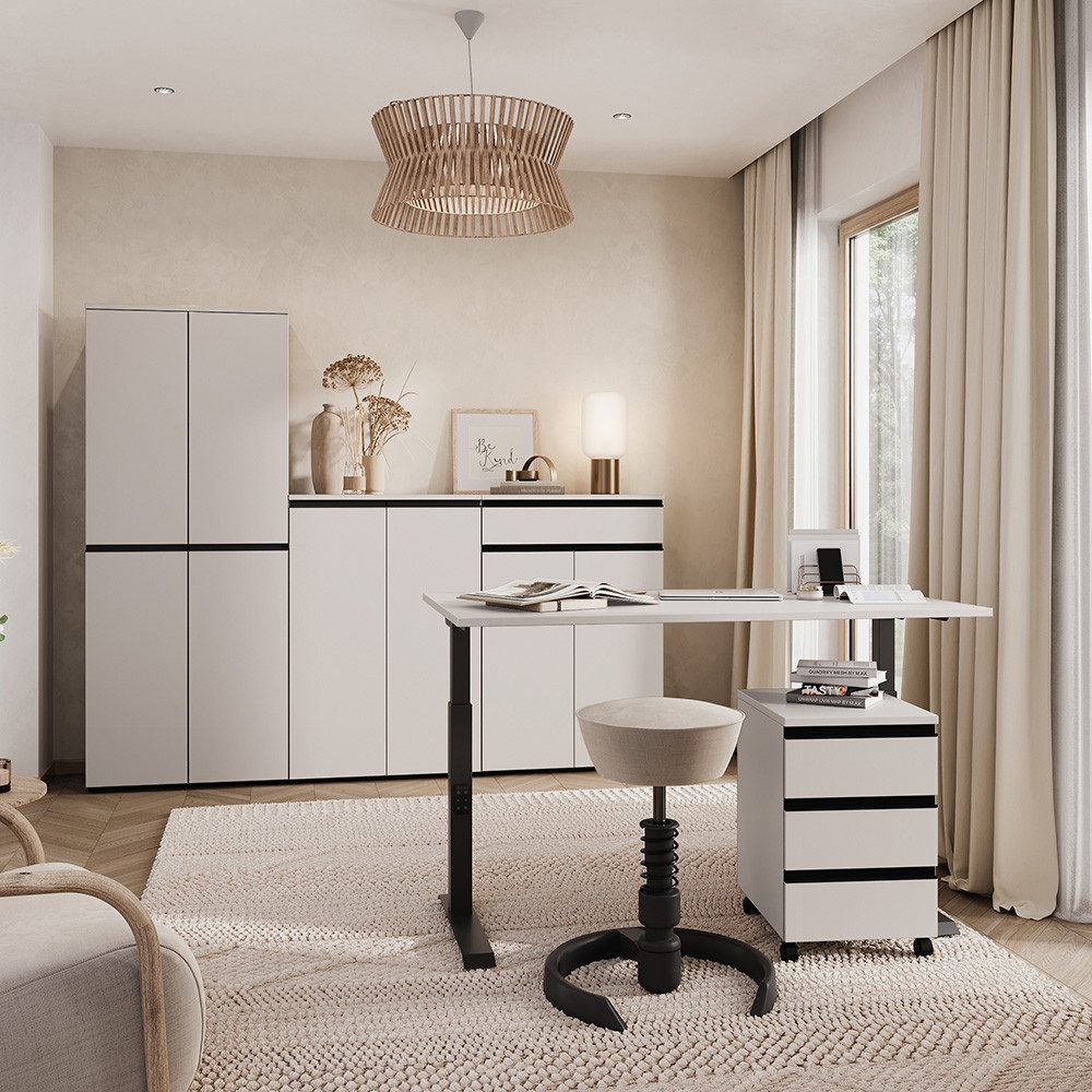 Diese Kollektion vereint minimalistisches Design mit Funktionalität, bietet grifflose Optik und ist mit Softclose-Türen sowie Schubladen ausgestattet. Die ergonomisch anpassbaren Schreibtische passen sich jeder Arbeitsweise an und unterstützen eine gesunde Haltung. Perfekt für ein modernes und komfortables Arbeitsumfeld.