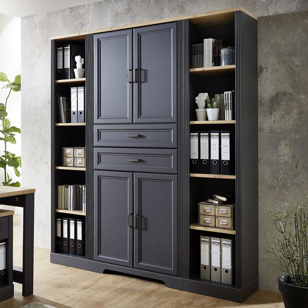 Die Büromöbelserie JÜLICH-36 bietet alles was das Herz für's Büro begehrt. Mit seinen vielen verschiedenen Teilen und praktischen Schrank-Regal Kombinationen sowie den Erweiterungen des Schreibtisches bist du in deinem Büro optimal ausgestattet und erhältst effizienten Stauraum mit tollem Design. Die Möbel sind zudem neben Graphit auch in Pinie hell erhältlich und können auch prima kombiniert werden. Der schicke oldschool Charme mit liebevollen Details in Artisan Eiche, der an den Landhaus- oder den antiken Wohnstil erinnert, bringt Gemütlichkeit in dein Büro, ohne auf praktischen Nutzen zu verzichten.