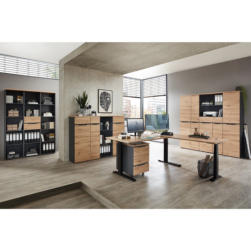 Entdecke unsere hochwertigen Büromöbel der Serie MANRESA-36 in Artisan Eiche Nb. mit Graphit – eine perfekte Symbiose aus zeitgemäßem Design und funktionaler Eleganz.