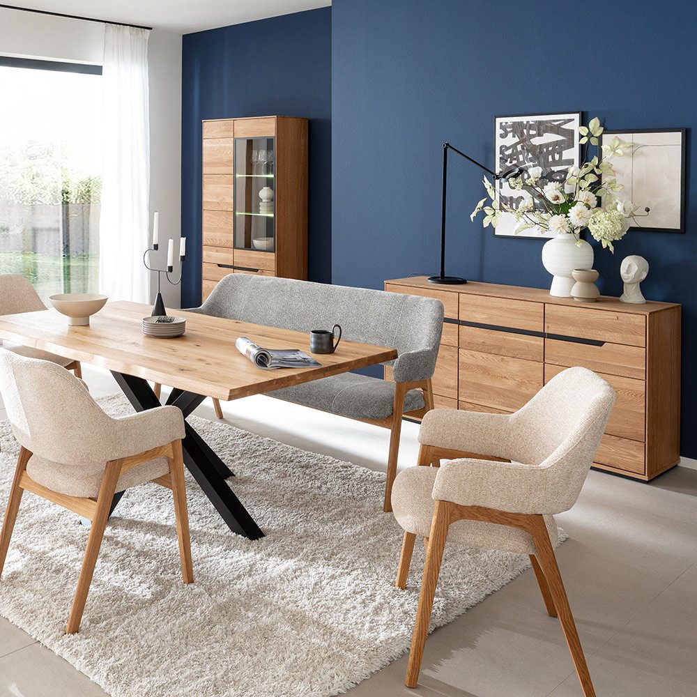 Warme Eichenfronten, elegante Glasdetails und markante Metallakzente machen dieses Esszimmer-Set zu einem besonderen Blickfang.