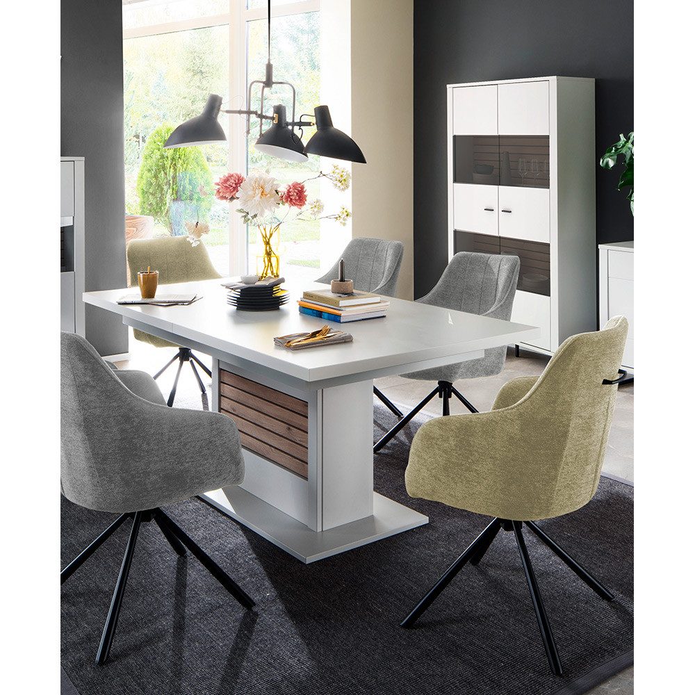 Verzaubere dein Zuhause mit unserer eleganten Wohn- und Esszimmermöbelserie in weiß, akzentuiert durch Lamellen in Eiche Nb.