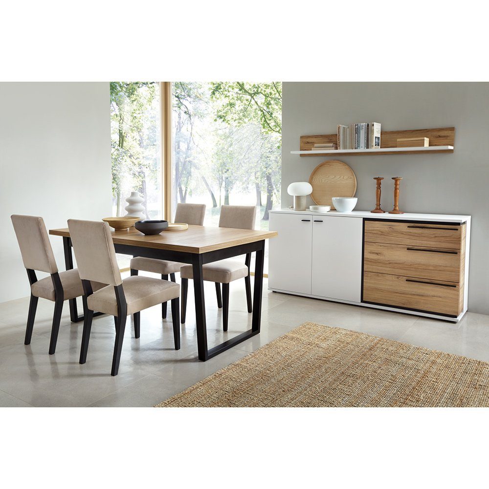 Die Möbelserie SANDVIKA-129 ist die perfekte Wahl für alle, die stilvolle Möbel suchen. Die Serie besticht durch ihre elegante Optik in Alpinweiß und dem ansprechenden Catania Eiche Nb. Dekor welches durch die Absetzungen in schwarz matt zusätzlich veredelt wird. Die Kombination aus diesen beiden Farben verleiht der Serie ein modernes und zeitloses Design.