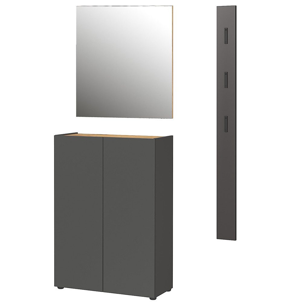 Dieses Set bringt Ordnung und Stil in deinen Eingangsbereich: Der Schuhschrank in edlem Graphit mit Navarra Eiche bietet großzügigen Stauraum. Das grifflose Design sorgt für eine klare Optik. Der passende Spiegel lässt den Raum größer und heller wirken, während das Garderobenpaneel mit Haken praktische Ablagefläche für Jacken, Taschen oder Schals bietet. Hochwertige Materialien, pflegeleichte Oberflächen und modernes Design machen dieses Set zum perfekten Begleiter im Alltag.