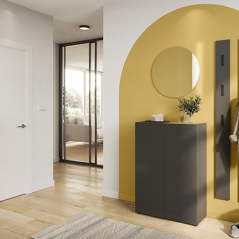 Dieses 3-teilige Garderoben-Set vereint modernes Design mit praktischer Funktion. Der grifflose Schuhschrank bietet großzügigen Stauraum für Schuhe und Accessoires. Das Garderobenpaneel mit klappbaren Haken ist flexibel nutzbar und verschwindet bei Bedarf dezent an der Wand. Ergänzt wird das Set durch einen runden Spiegel, der für optische Leichtigkeit sorgt. Hochwertig verarbeitet und hergestellt in Deutschland, sorgt dieses Garderoben-Set für Ordnung, Stil und einen perfekten ersten Eindruck.
