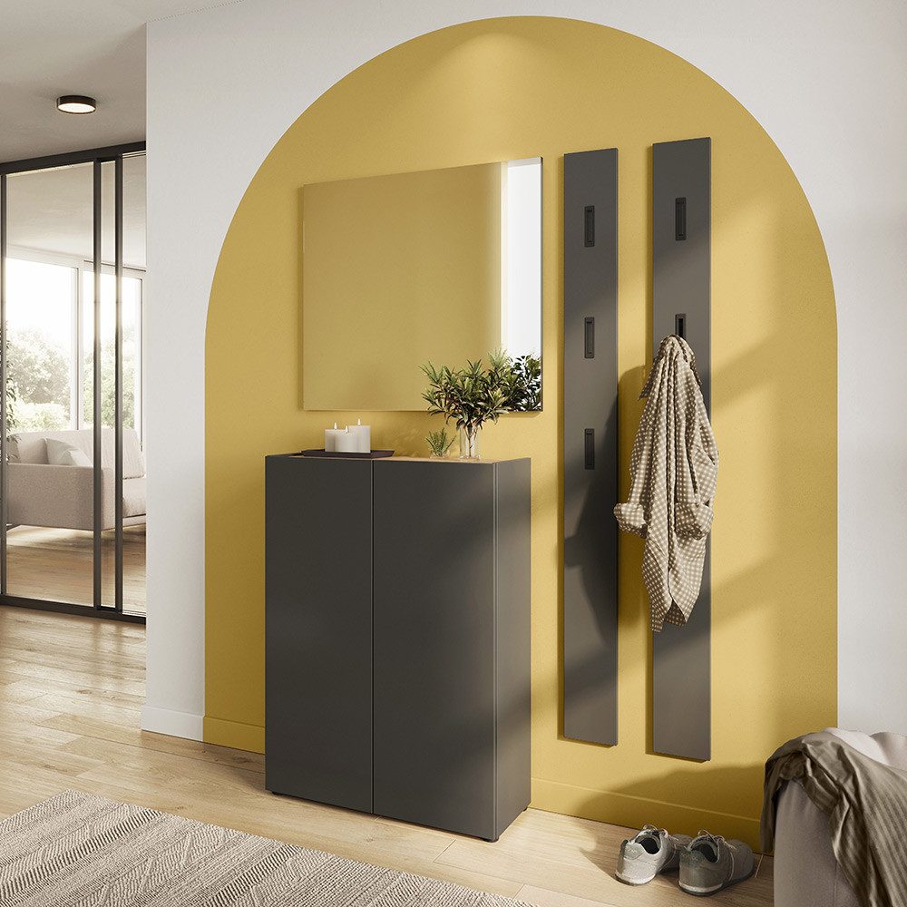 Dieses Set bringt Stil und Ordnung in deinen Flur: Der Schuhschrank in edlem Graphit mit warmer Navarra Eiche bietet hinter grifflosen Türen viel Platz für deine Schuhe und Accessoires. Der passende Spiegel ergänzt das Set perfekt und verleiht deinem Eingangsbereich mehr Tiefe und Helligkeit. Zwei Garderobenpaneele mit praktischen Haken sorgen zusätzlich für ausreichend Platz für Jacken, Taschen und Schals. Robuste ABS-Kanten und zeitlos schönes Design macht dieses Set zum Must-have für dein Zuhause.