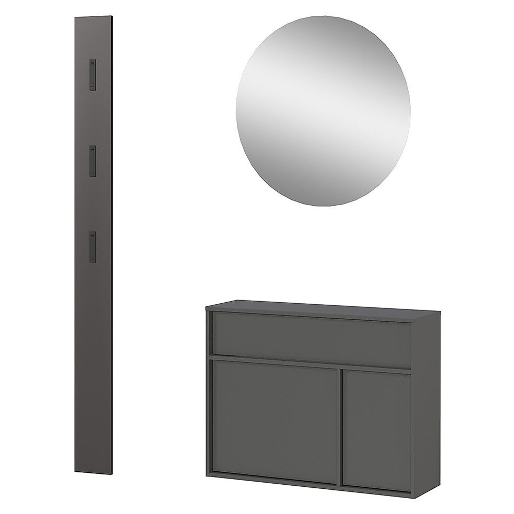 Der runde Spiegel vergrößert den Raum, das schlanke Paneel bietet Platz für Jacken oder Taschen und der grifflose Schuhschrank sorgt für Stauraum ohne Kompromisse. Всеs in ruhigem Graphit – modern, unaufdringlich und alltagstauglich. Ob in der Diele, im Eingangsbereich oder im Flur – dieses Set ist der ideale Startpunkt für dein Zuhause.