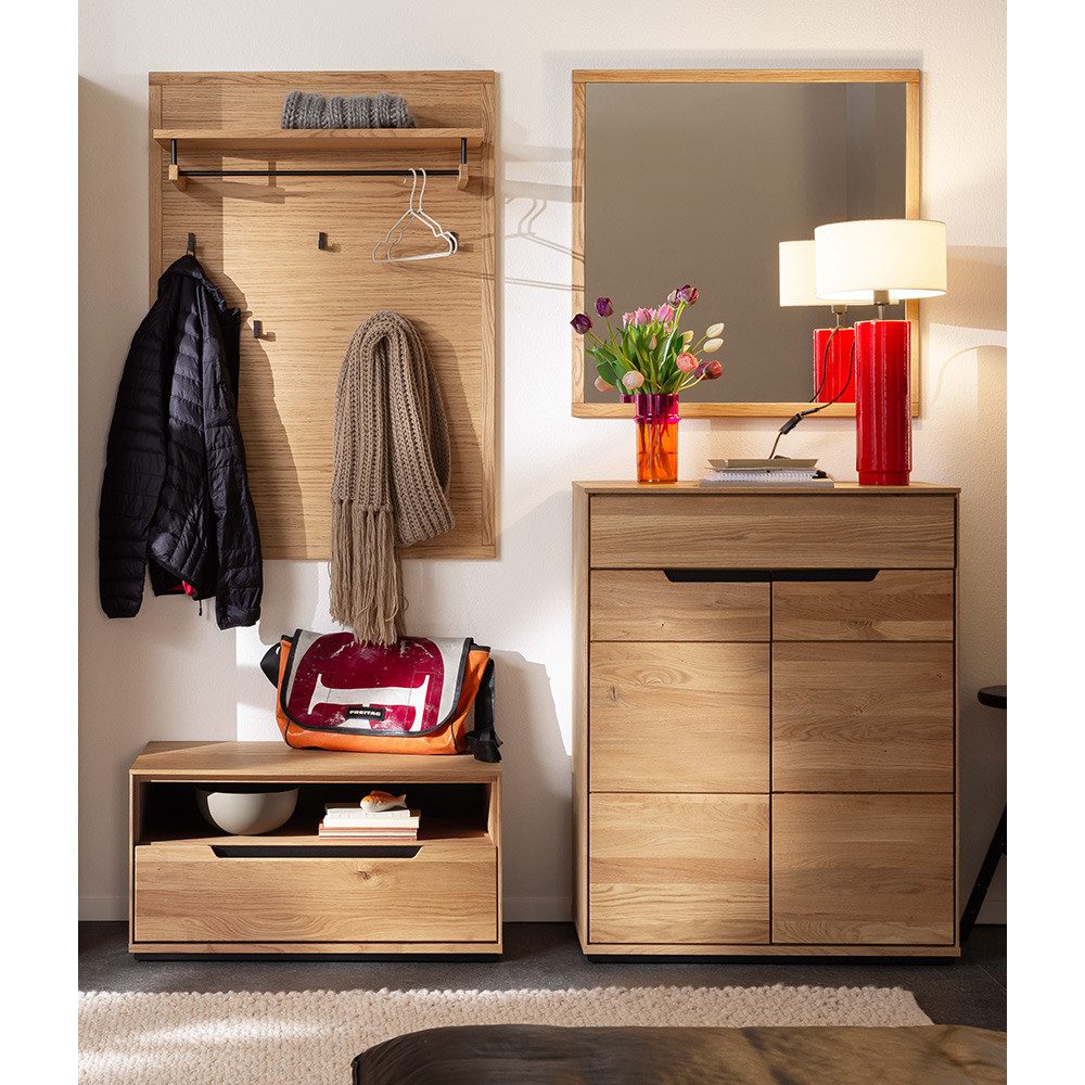 Dieses Garderoben-Set aus geölter Eiche schafft mit Bank, Schuhschrank, Paneel und Spiegel einen einladenden Eingangsbereich. Warme Holztöne treffen auf elegante schwarze Details und bieten Stauraum für alles, was du täglich brauchst.