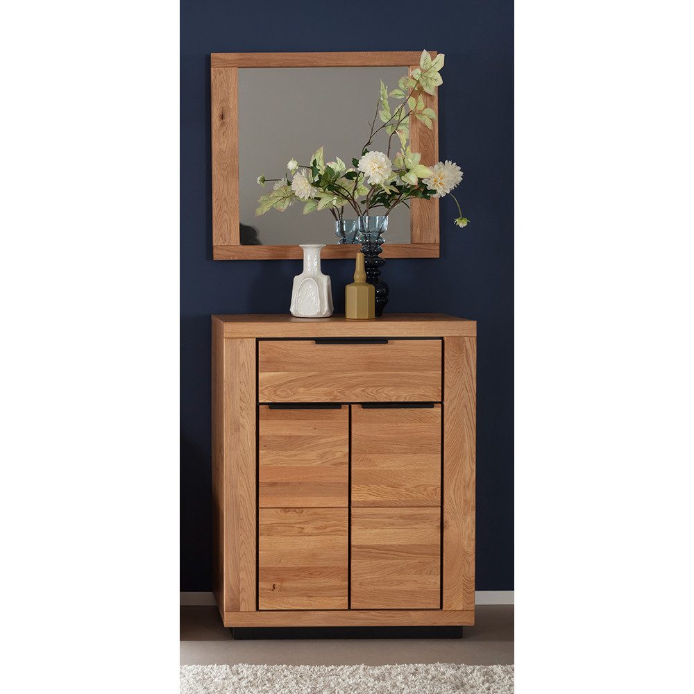 Die Kommode mit Fronten aus massiver Wildeiche geölt und Korpus in passender Nachbildung bietet Platz für Alltagsgegenstände. Der verstellbare Einlegeboden hinter den Türen und die Schublade schaffen Ordnung im Handumdrehen. Der Spiegel mit massivem Rahmen sorgt für Licht und optische Weite. Schwarze Griffe setzen moderne Akzente.
