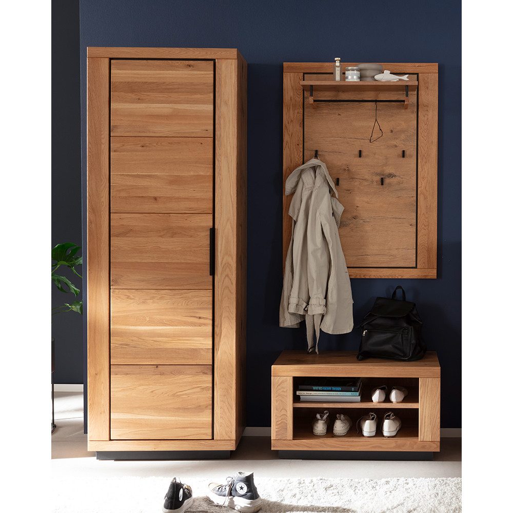 Fronten aus massiver Wildeiche geölt harmonieren mit dem Korpus in passender Nachbildung und bringen Behaglichkeit in deinen Flur. Mit Bank, Schrank und Paneel hast du Stauraum, Ordnung und Design perfekt kombiniert. Schwarze Griffe, Haken und Stange setzen moderne Akzente.